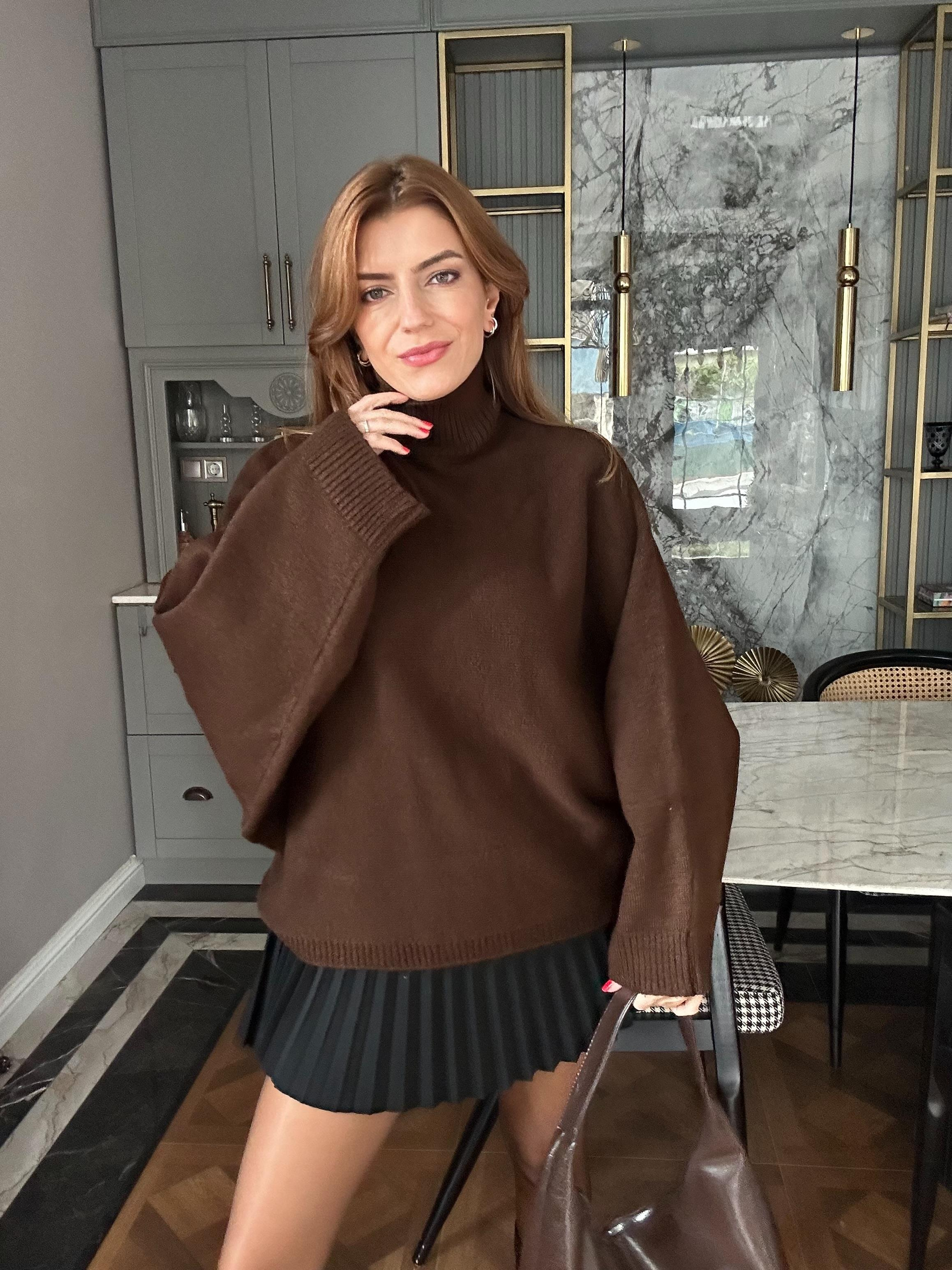 KazakAcı Kahve Dik Yaka Yarasa Kol Kazak
