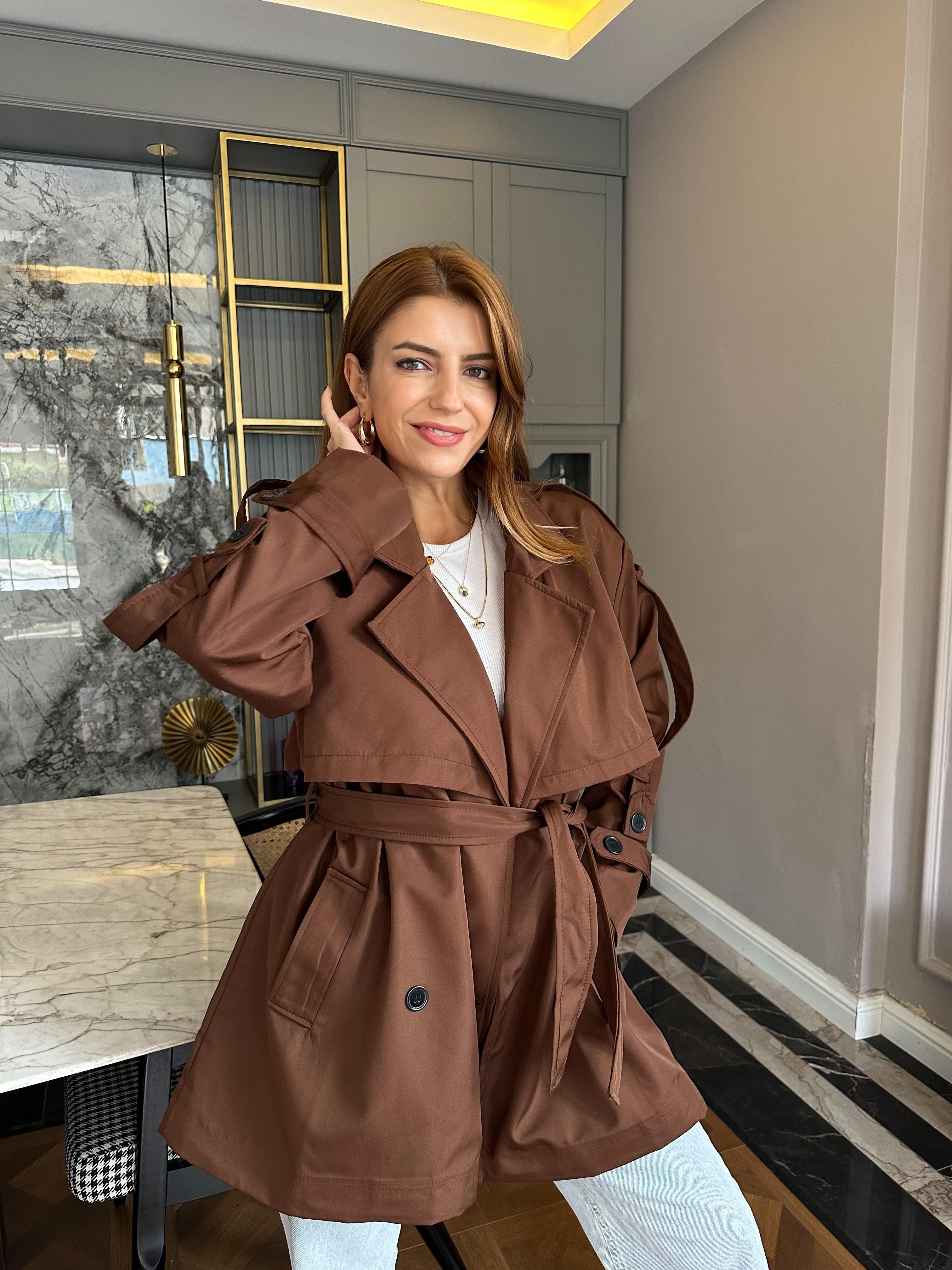 CeketAcı Kahve Orta Boy Kemerli Trençkot