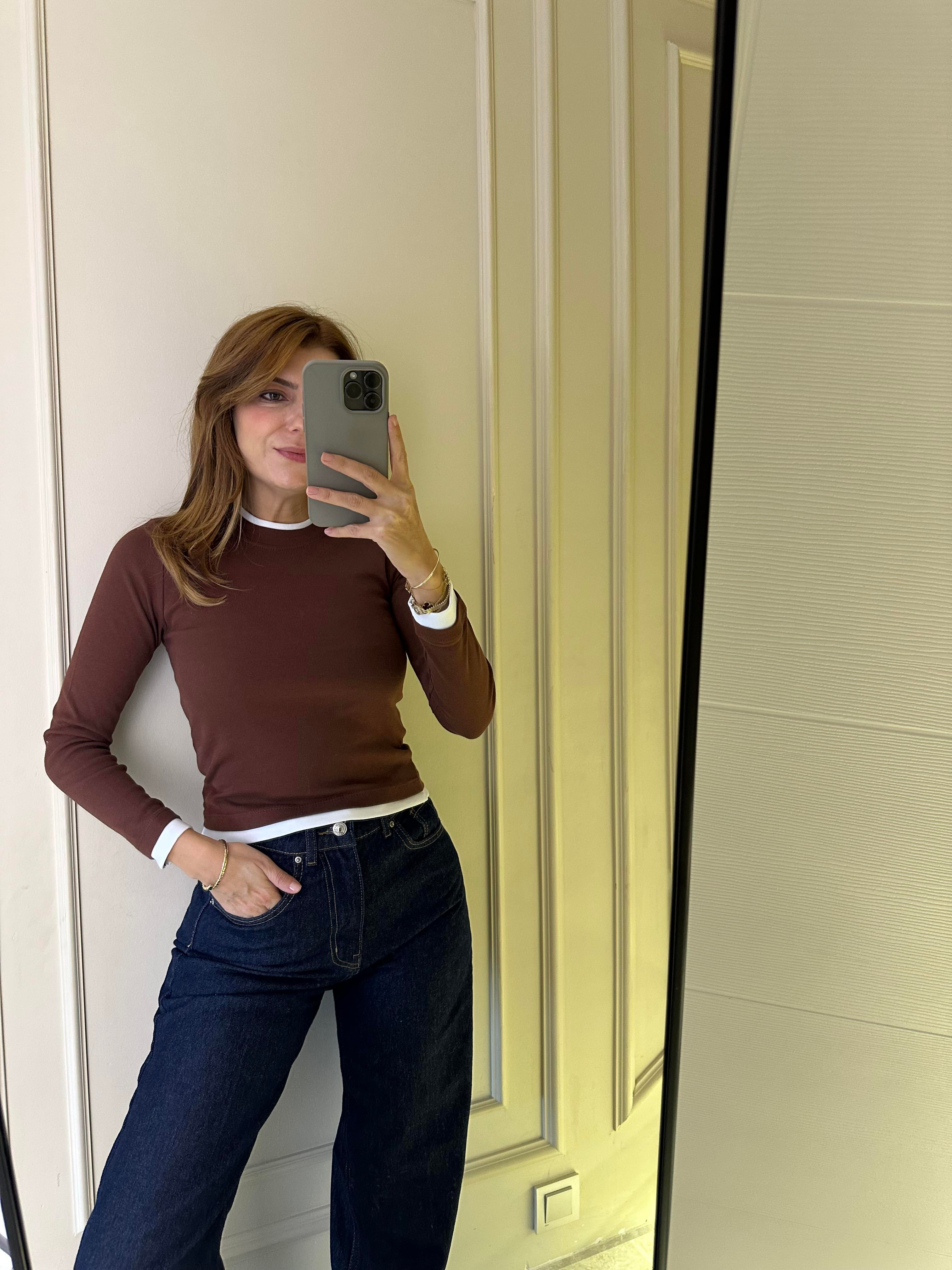 Uzun Kollu BluzAcı Kahve Ribana Yaka İkili Bluz