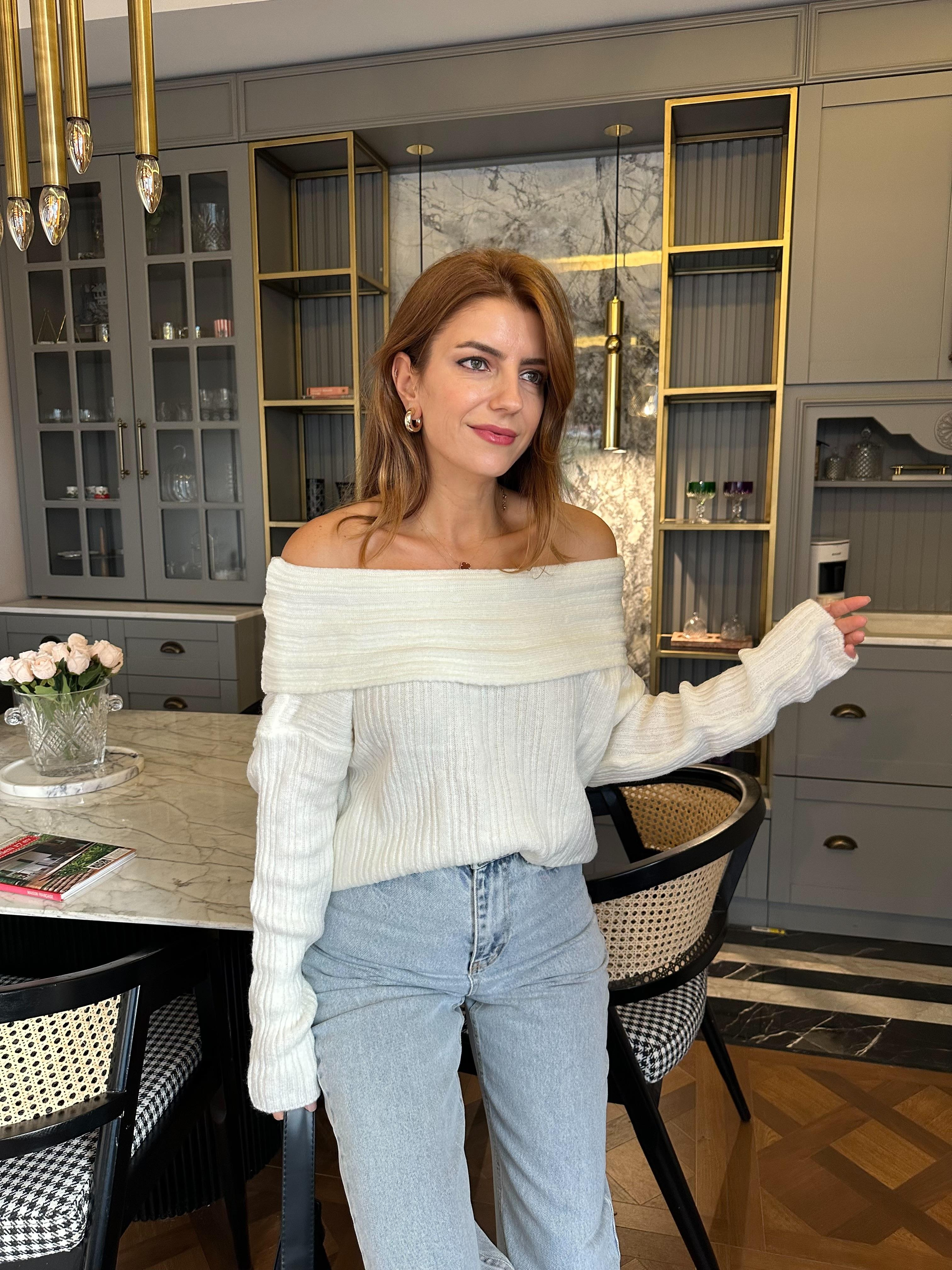 Beyaz Madonna Yaka Şardonlu Triko Kazak (26277)