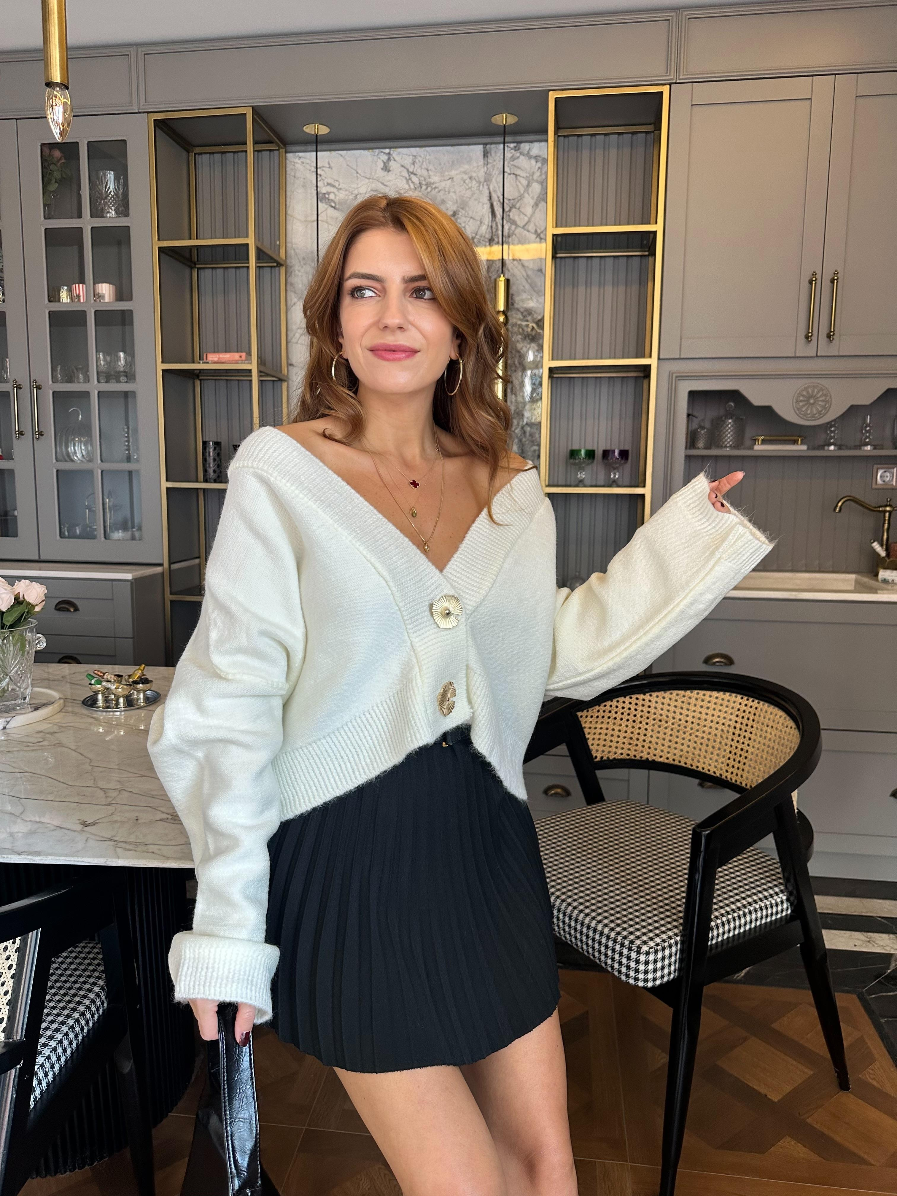 HırkaBeyaz Metal Aksesuar Düğmeli Triko Hırka