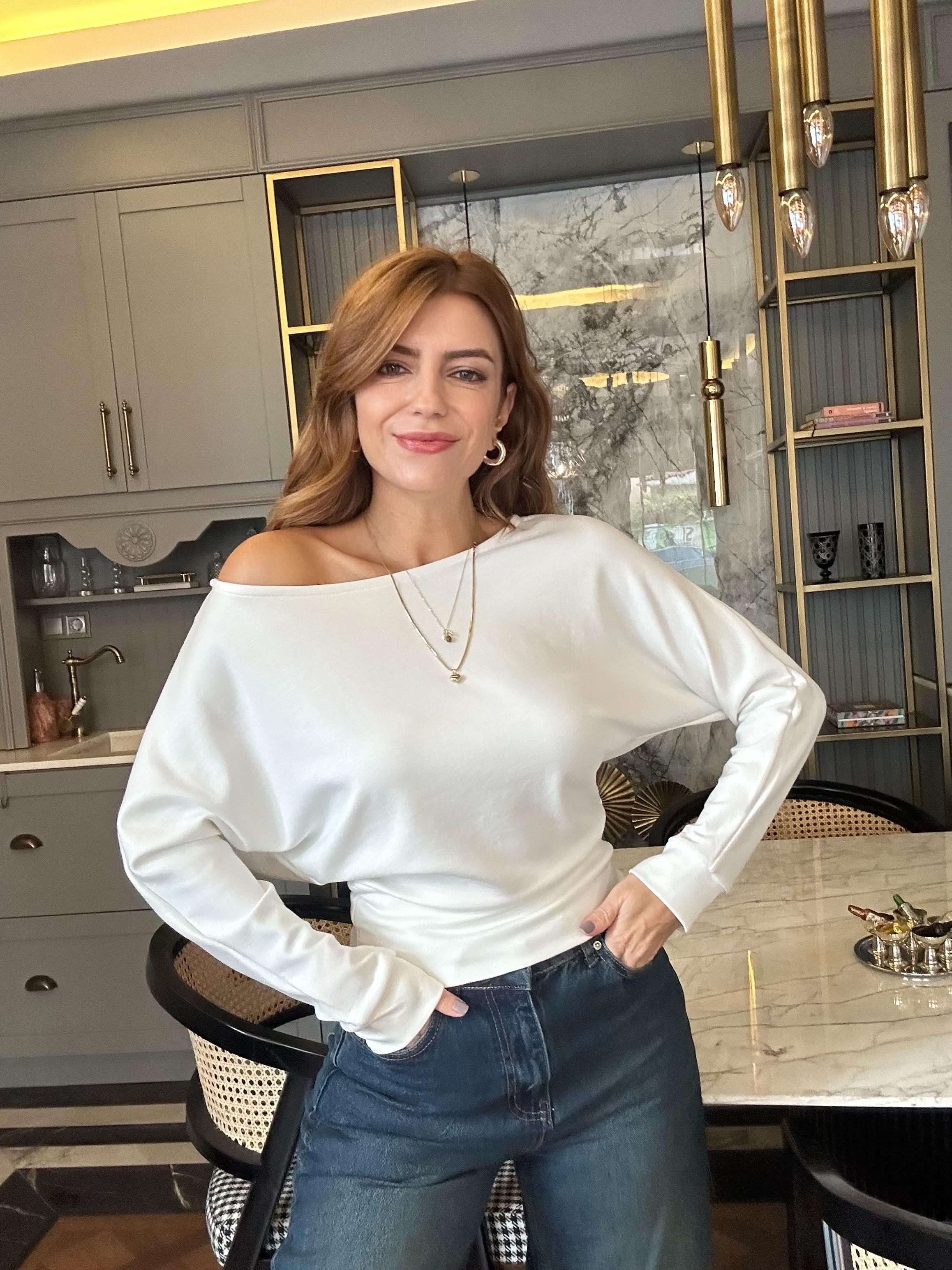 Uzun Kollu BluzBeyaz Pamuk Kumaş Kayık Yaka Bluz