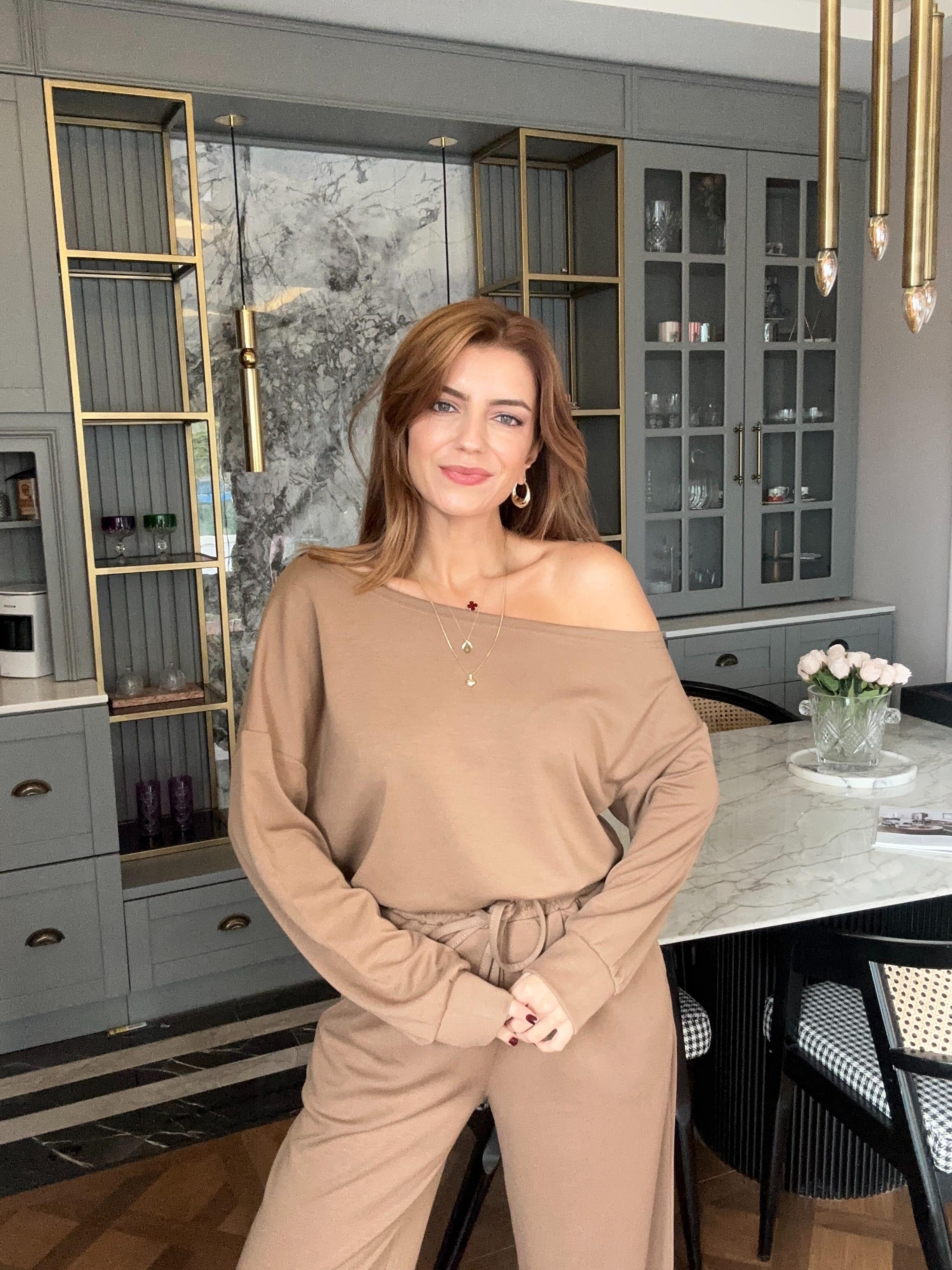 Pantolonlu TakımCamel Düşük Omuz Pamuklu Kumaş Takım
