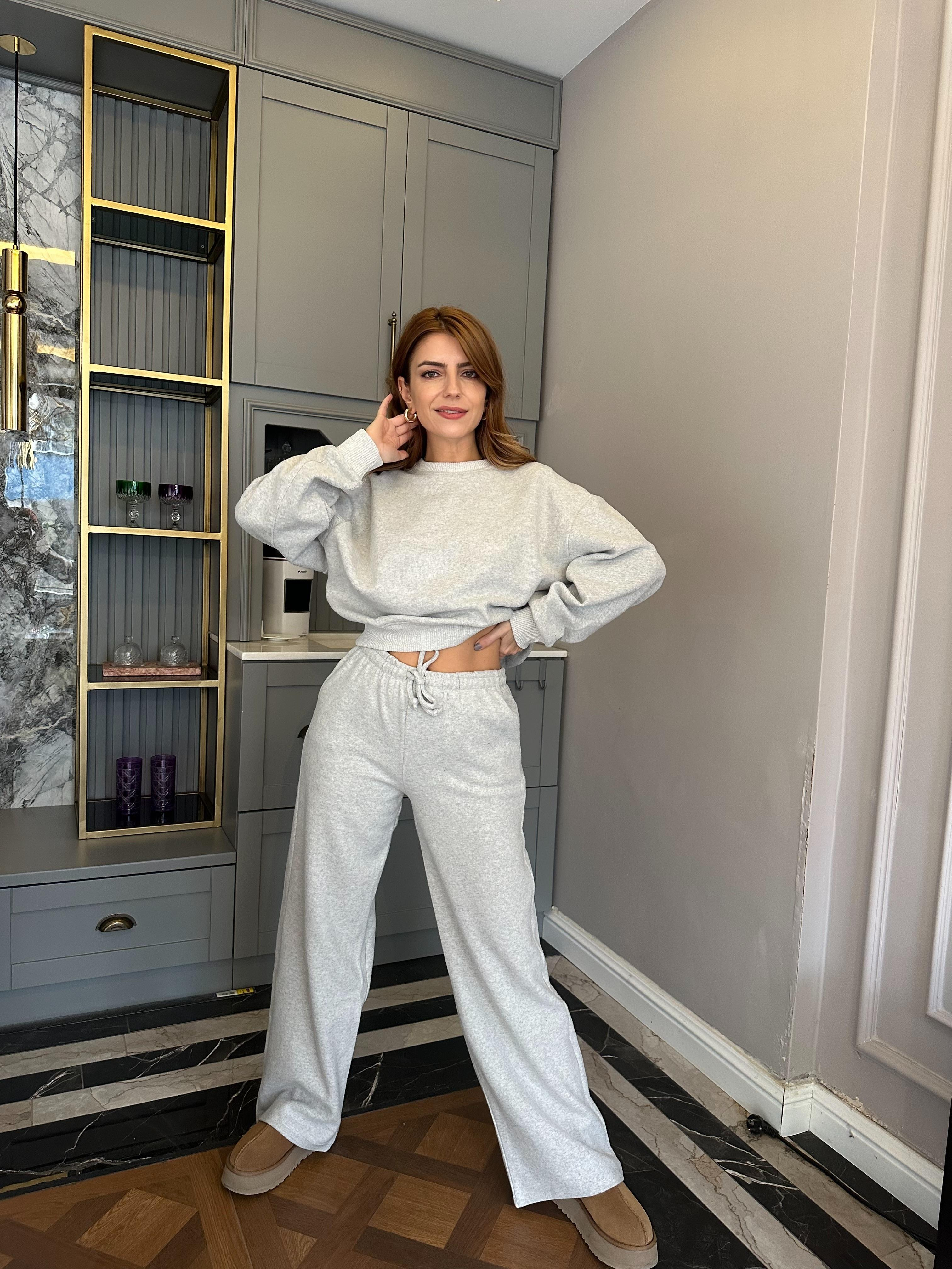 Pantolonlu TakımGri Ribanalı Selanik Kumaş Takım