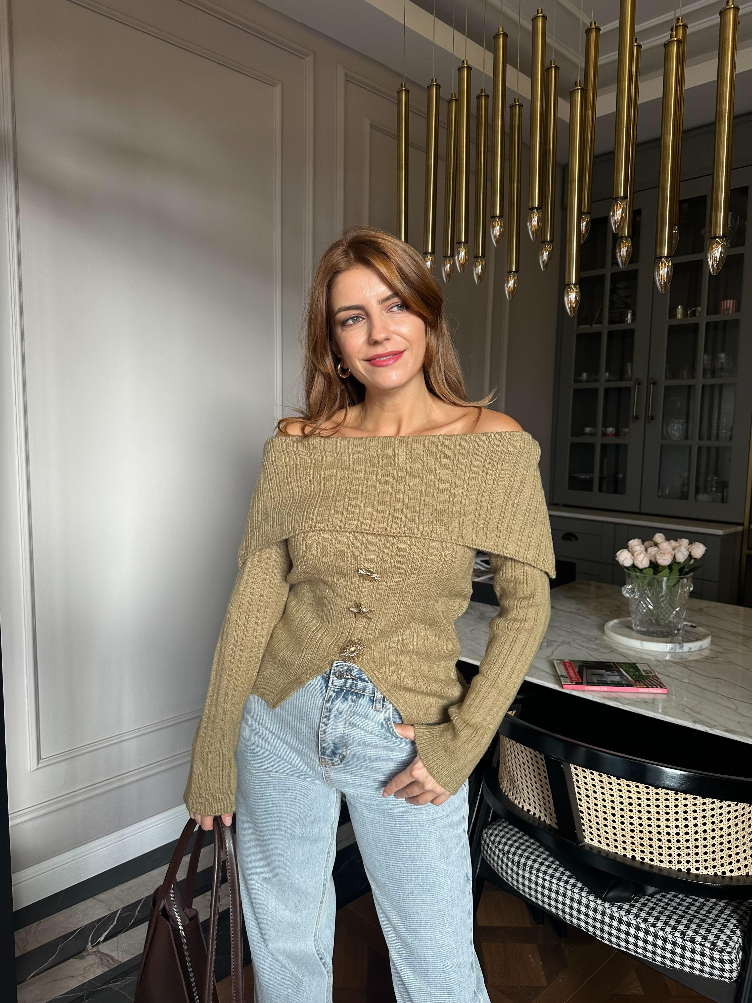 Haki Aksesuarlı Madonna Yaka Kazak (26235)