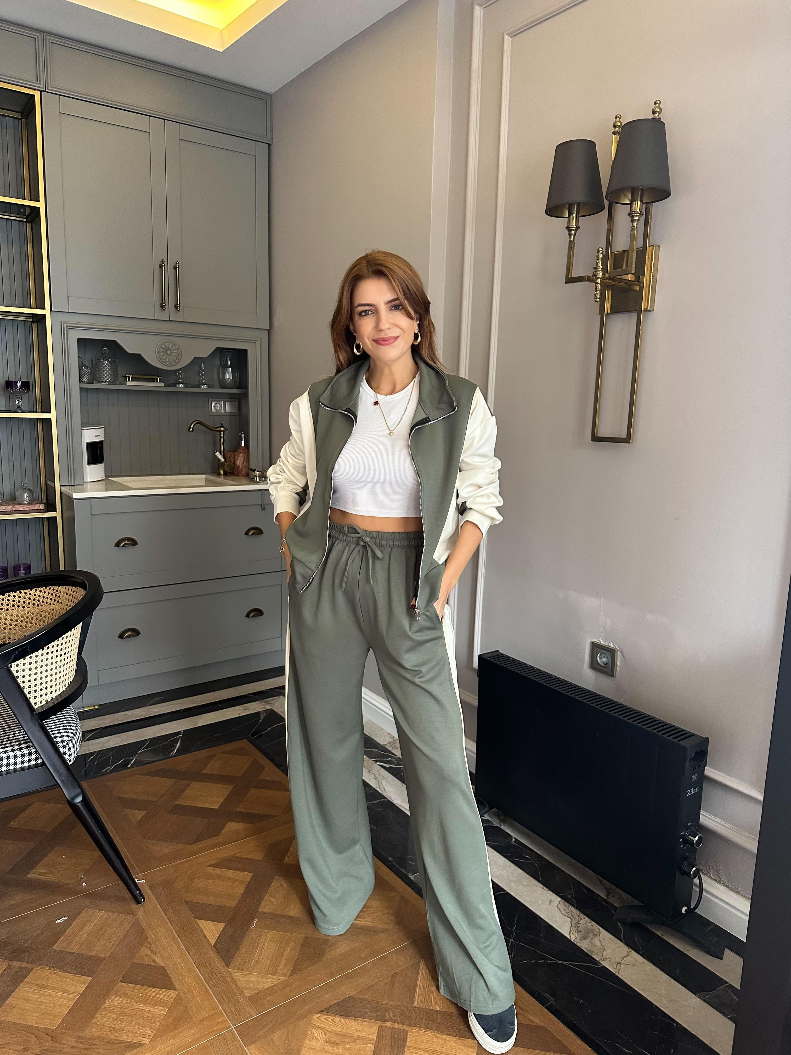 Haki Şeritli Pamuk Kumaş Eşofman Takımı (26344)