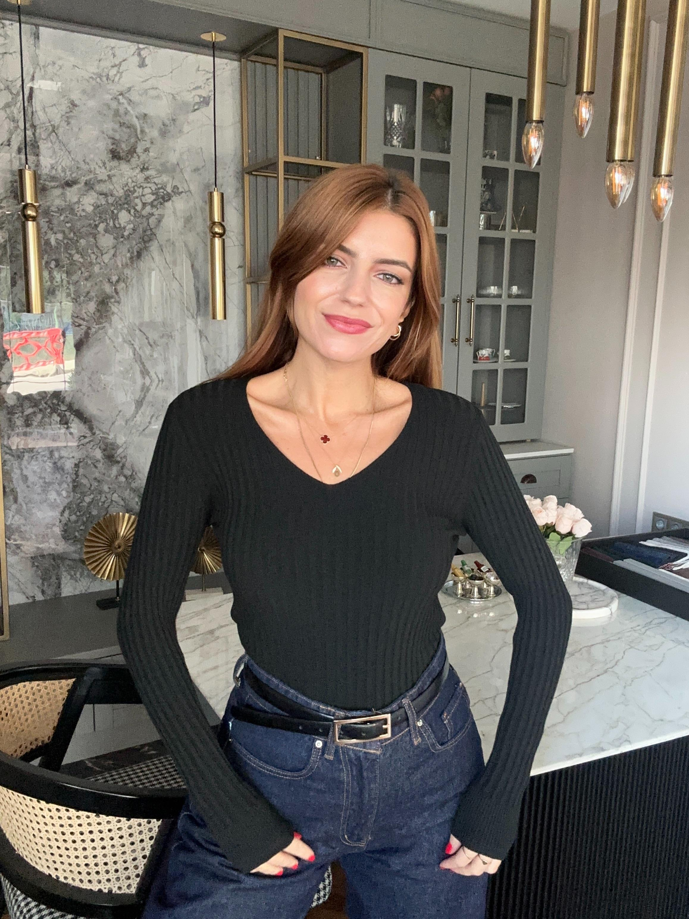 Triko BluzSiyah Fitilli V Yaka Triko Bluz