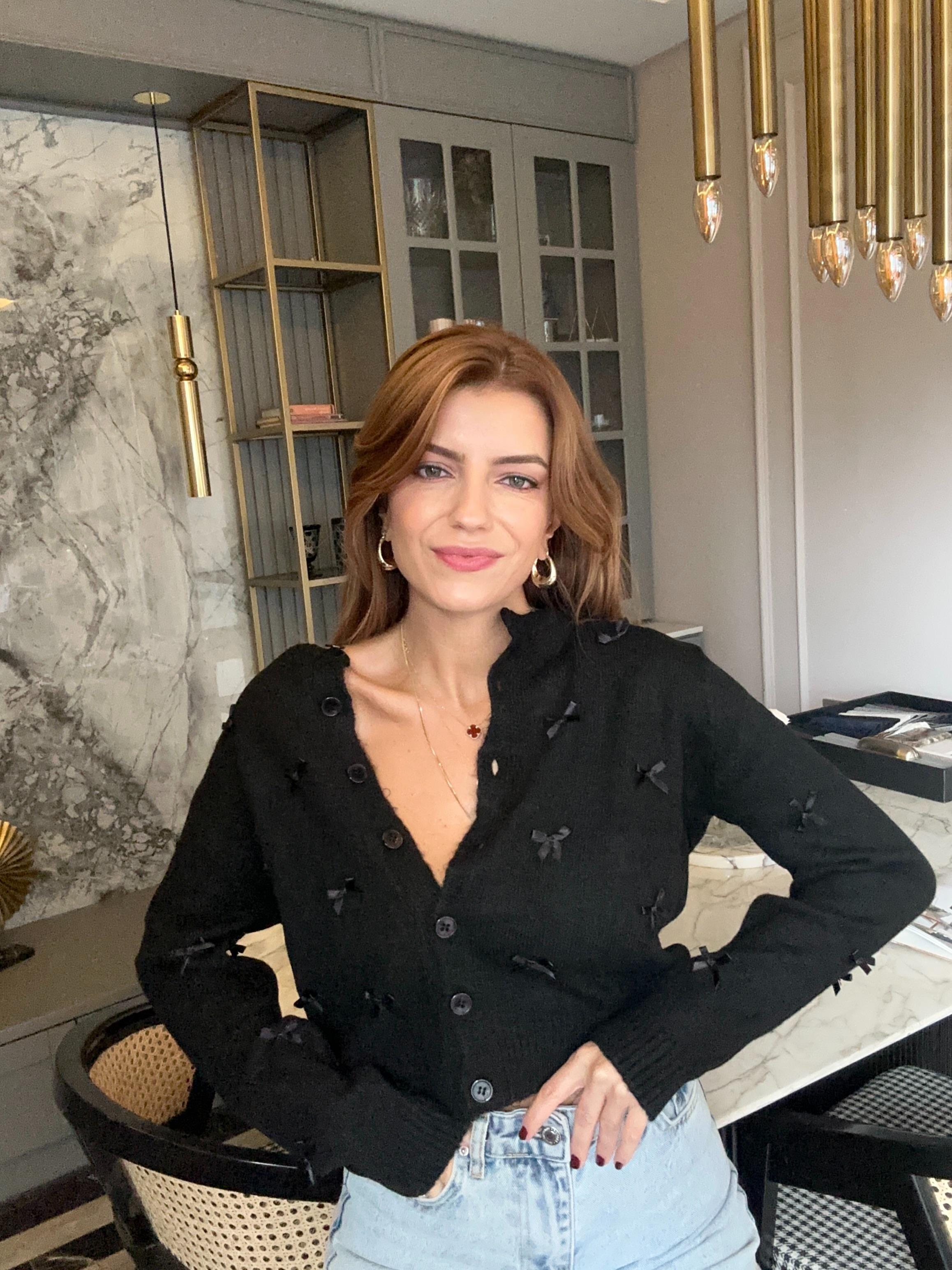 Siyah Kurdeleli Düğmeli Yün Hırka (26327)