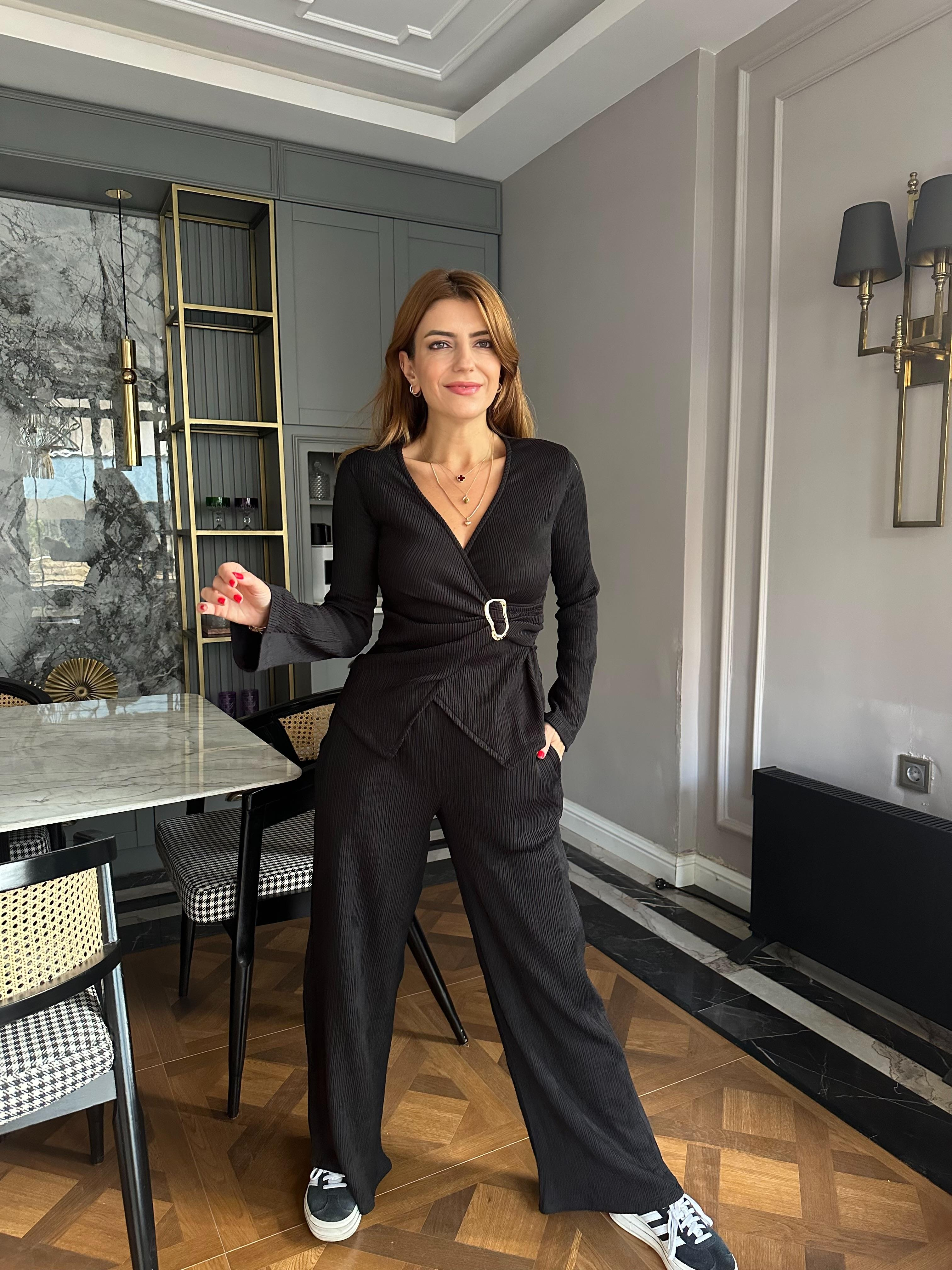 Pantolonlu TakımSiyah Metal Aksesuarlı Fitilli Kruvaze Takım