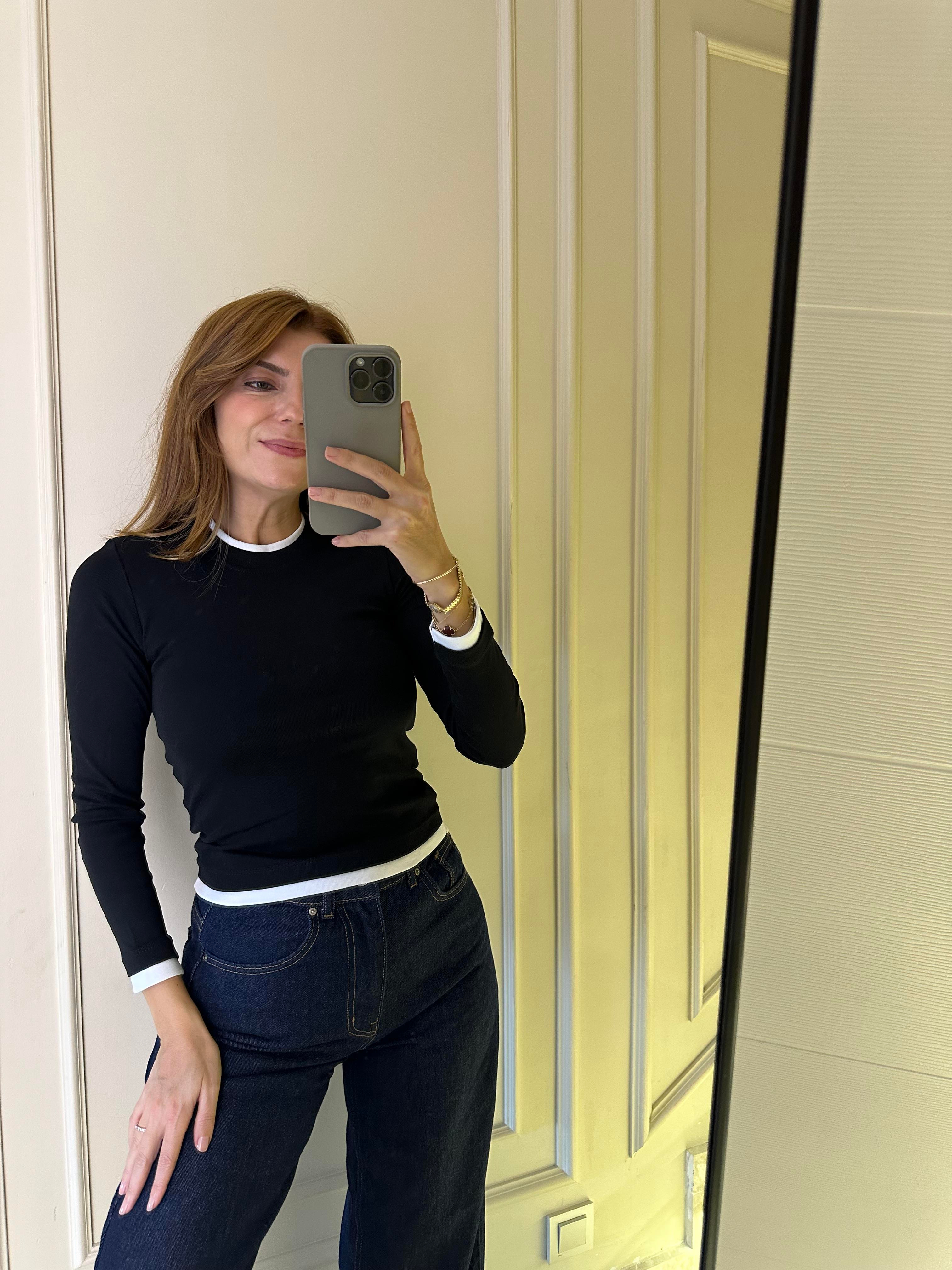 Uzun Kollu BluzSiyah Ribana Yaka İkili Bluz